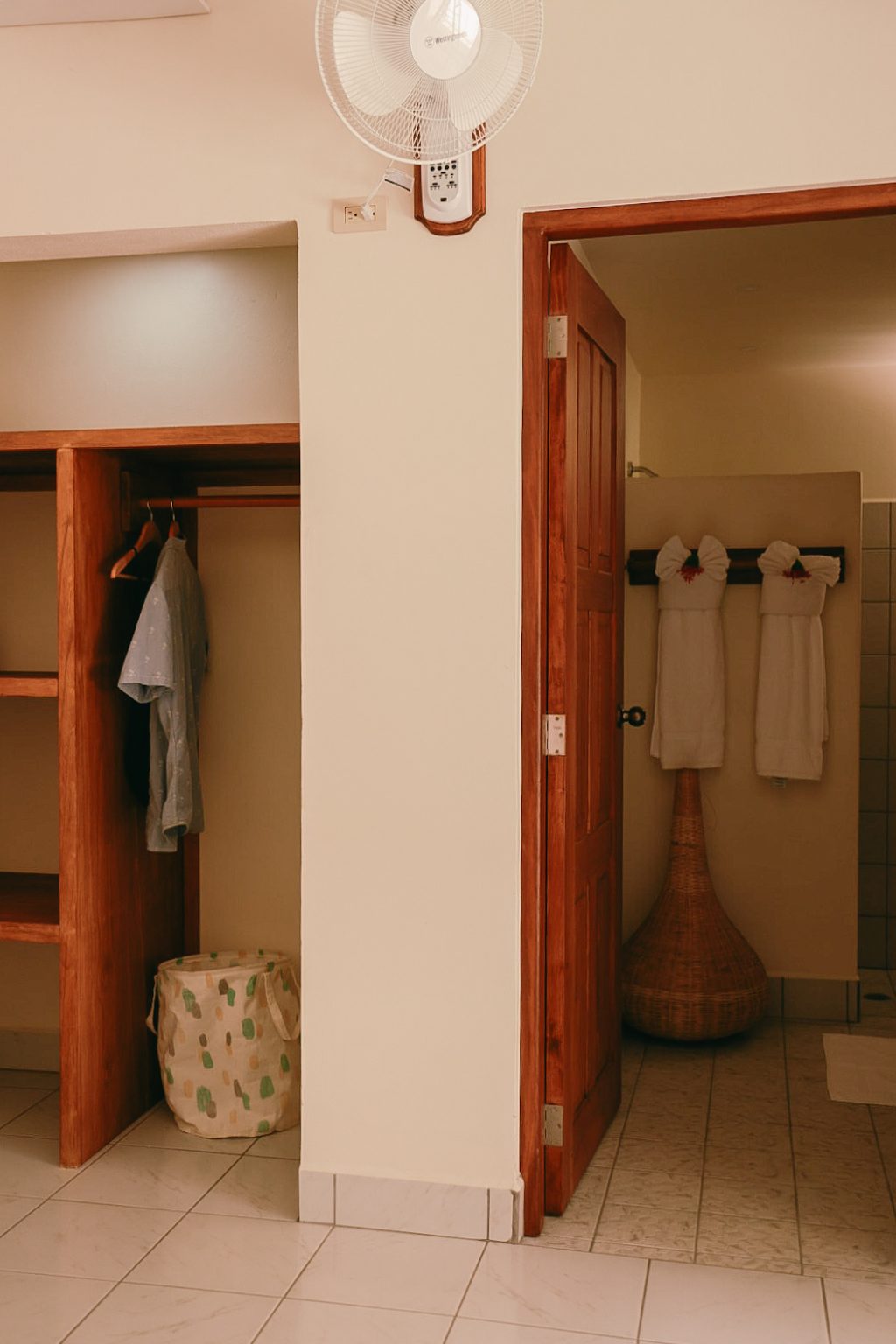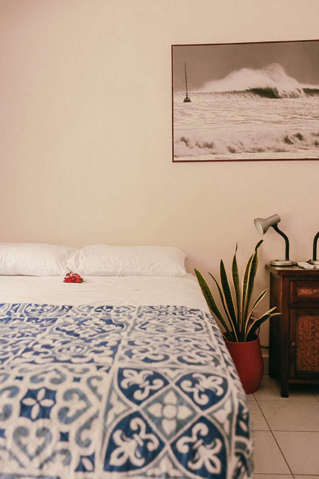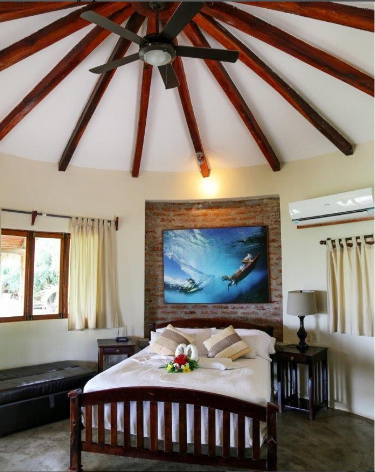 Escape to your own peaceful hideaway just steps from the surf. This private casita for two features a comfortable queen bed, private bathroom, outdoor terrace, desk, closet, surf rack, air-conditioning, towels, and high-speed WiFi, everything you need for a relaxed and connected stay.